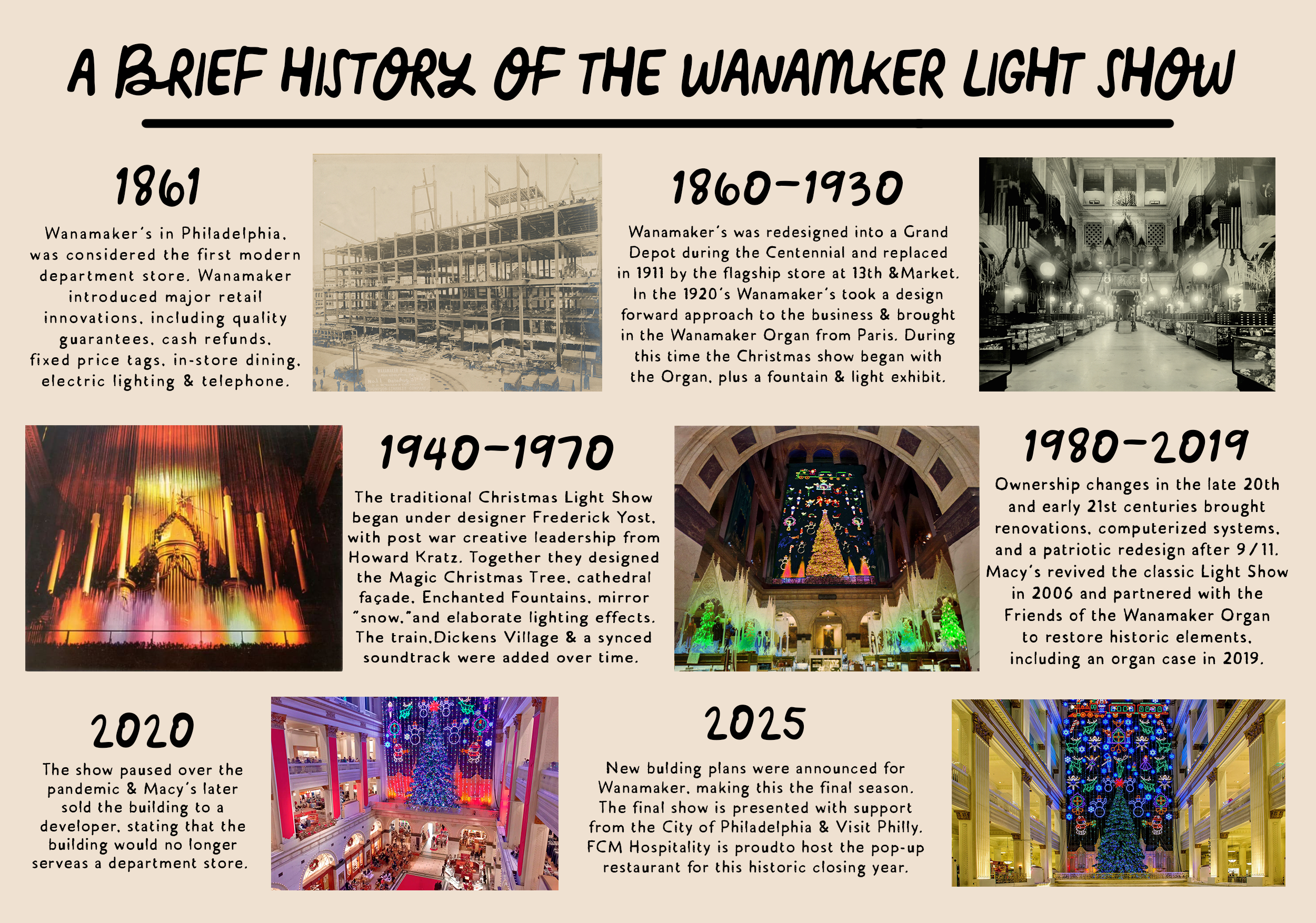 Holly & Humbug transforms a corner of the legendary Wanamaker Building into a pop-up bar and restaurant. Enjoy seasonal cocktails, comfort food, and a cozy atmosphere just steps from the world-famous Wanamaker Light Show and Dickens Village. Whether you’re visiting before the show, taking a break from shopping, or meeting friends for a holiday toast, Holly & Humbug is your place to gather and celebrate the final year of the oldest light show in Philadelphia.